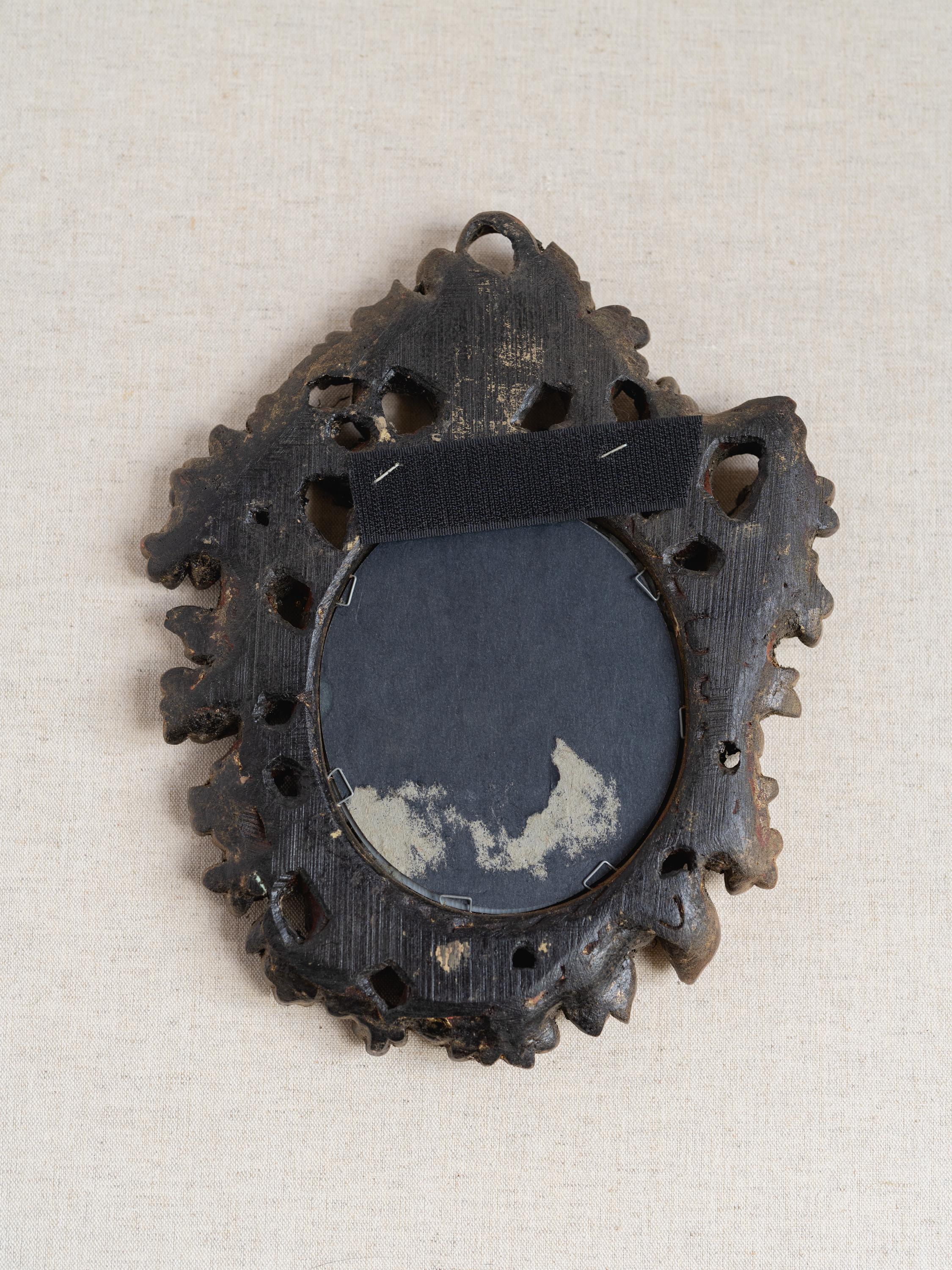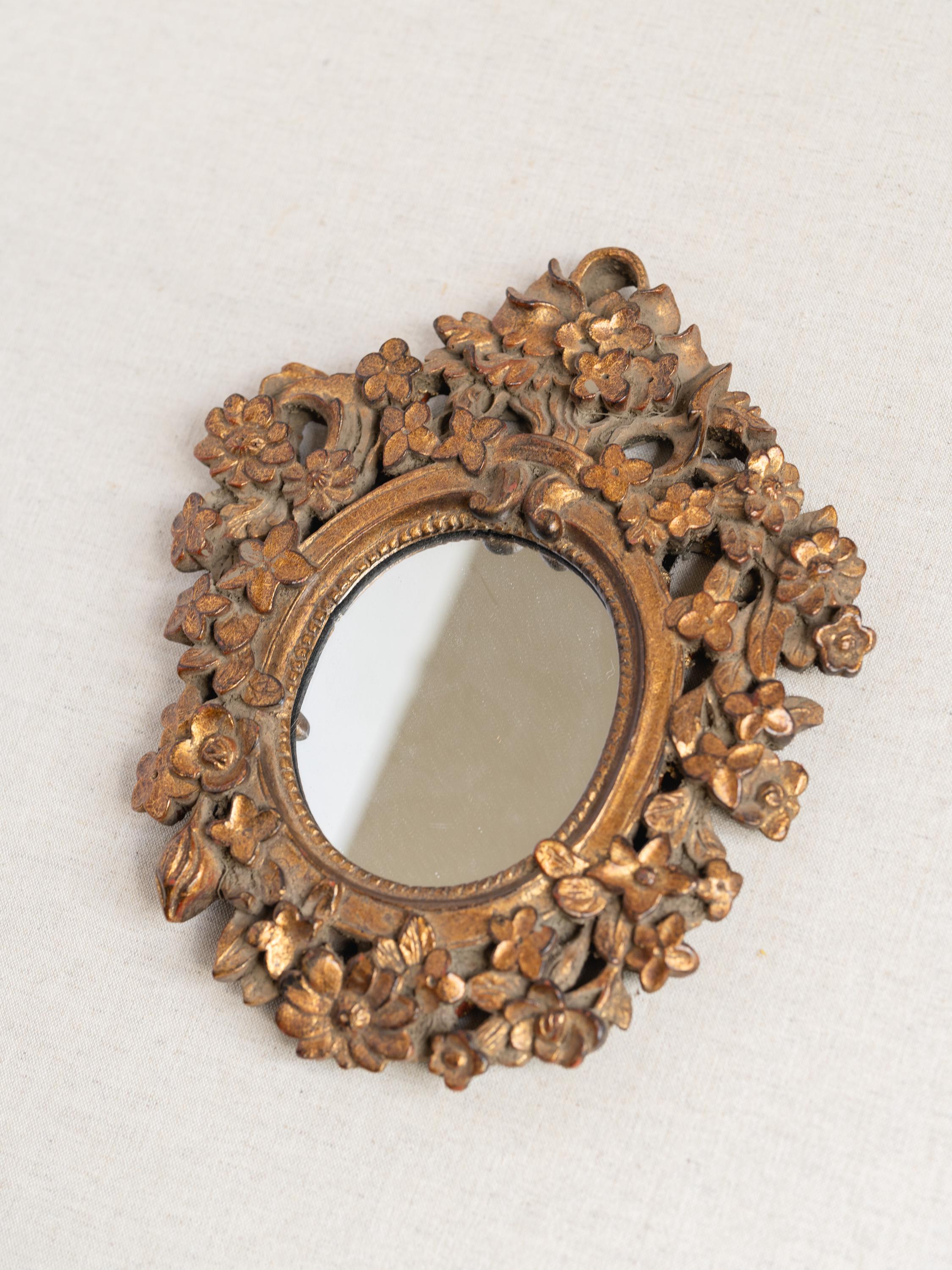 A beautiful small mirror with a lovely patina. Its wooden scrolled frame with floral details would look stunning in a tiny nook in your home or above your bed.